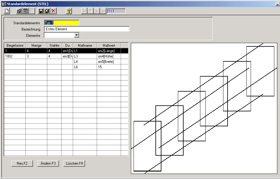 Mittels der Funktionalitäten für die Erstellung von Elementen, lassen sich sehr schnell Elemente verwalten und daraus Stahllisten erstellen. Diese Daten stehen später auch im Zusatzmodul Produktionsplanung und Maschinenansteuerung bereit.